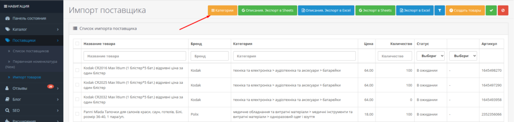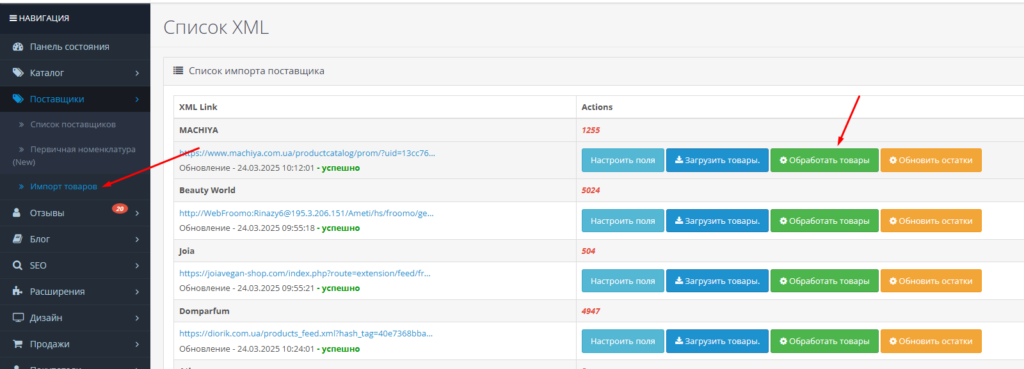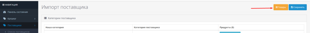 Переходим в меню Поставщики -> Импорт товаров -> Обработать товары