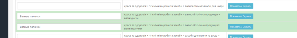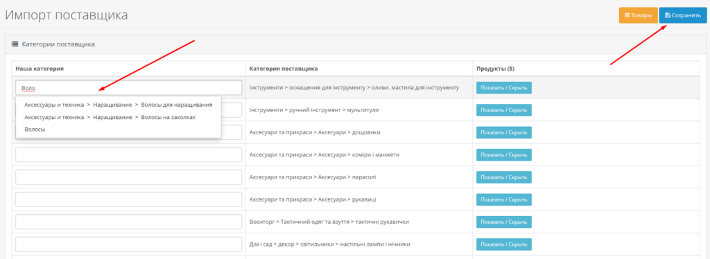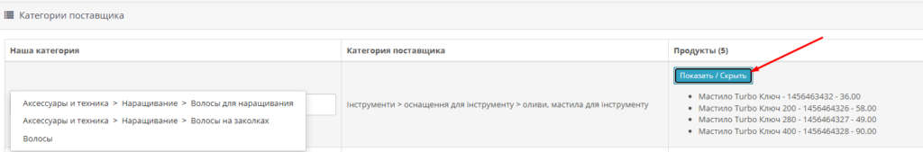 Если не совсем понятно, что представлено в категории поставщика, можно посмотреть несколько товаров из этой категории, нажав Продукты — Показать / Скрыть