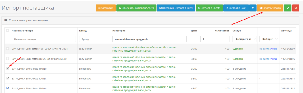 Используя стандартную фильтрацию, галочками выбираем товары, которые мы хотим создать и нажимаем кнопку Создать товары.