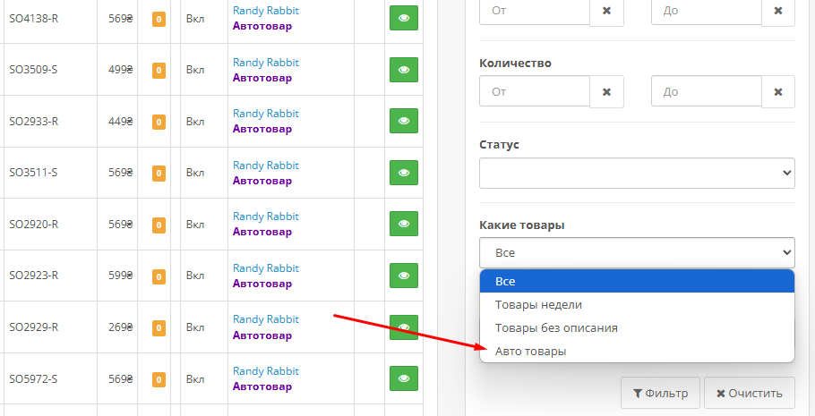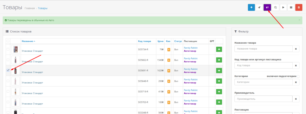 Чтобы перевести автотовар в обычный, в списке товаров в меню Каталог -> Товары, нужно выбрать нужные товары и нажать кнопку